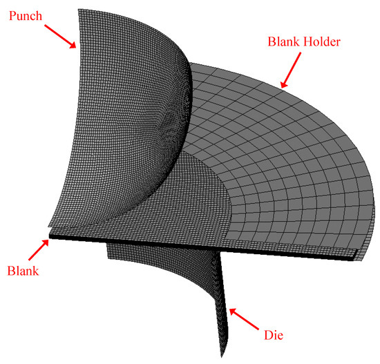For the Nakazima dome test simulations (see Figure 7), a similar modelling approach was employed with a solid element size of 0.15 mm within the blank. The tooling (punch, blank holder and die) were modelled as rigid bodies and a penalty-based contact algorithm with a constant Coulomb friction coefficient of 0.05 was used between the punch and the blank. This friction coefficient was taken from [59] where twist-compression tests were used to experimentally determine the friction coefficient of ZEK100-O using Teflon® film lubrication at room temperature. Moreover, a friction coefficient of 0.4 with the same penalty-based contact algorithm was enforced between the blank and the die and blank holder (unlubricated). A constant blank holder force of 165 kN (quarter-symmetry) was applied to the binder to simulate the experimental clamping condition. In Section 6, the results of the finite element simulations are compared with the experimental results in terms of local strain paths, as well as the far-field load-displacements.