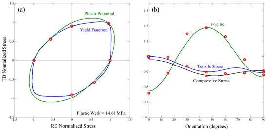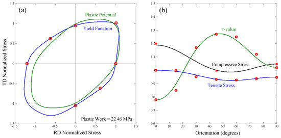 (a) Yield function and plastic potential and (b) uniaxial yield stress ratios and r-values at the plastic work level of 14.61 MPa. Symbols show the experimental results.