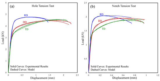 The hole tension specimen shown in Figure 4a has become commonly adopted to characterize the plasticity and fracture of sheet materials [49,53,54,55]. This test is of particular interest to the fracture community since the stress state at the edge of the hole remains close to uniaxial tension up to large values of deformation. However, the gauge area or ligament of the specimen experiences a range of stress states from uniaxial tension at the free boundaries towards the plane-strain state at some location behind the hole edge. Therefore, given the wide range of stress states, this test can be considered as a good evaluation test for the predictions of the plasticity model. The hole tension tests were performed in the three orientations of the rolling (RD), diagonal (DD) and transverse (TD) directions with a cross-head velocity of 0.005 mm/s resulting in a von Mises equivalent strain rate of approximately 0.001 s−1 at the gauge area.
