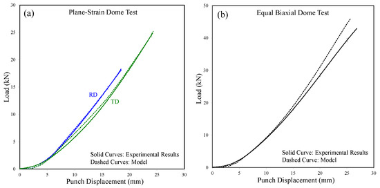 Experimental data compared with the predictions of the finite element model in terms of the punch force-displacements for the dome test experiments: (a) plane-strain; and (b) equal-biaxial.