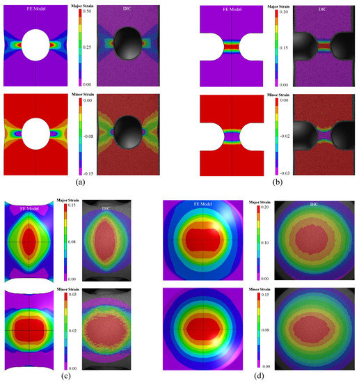 Comparison of the results of the finite element models and experiments in terms of contours of major and minor strains for (a) hole tension; (b) notch tension; (c) plane-strain dome; and (d) equal-biaxial dome tests. The hole tension, notch tension and plane-strain dome tests and simulations were performed in the rolling direction. Note that the finite element contours have been mirrored using the symmetry assumption.