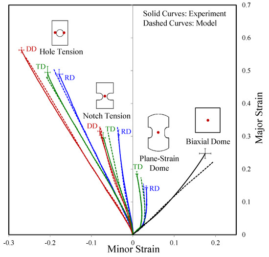 It can be observed from Figure 13a that the punch force-displacement predictions from the finite element model are in accordance with experimental results for the plane-strain dome tests in both orientations of the RD and TD. Furthermore, the model predicts the strain paths of these tests with good accuracy as shown in Figure 15. However, the model over predicts the punch force for the equal-biaxial dome test by approximately 12% as shown in Figure 13b. From the strain path of the equal-biaxial test in Figure 15, it appears that the model does not accurately reproduce the experimental data in terms of change of the strain path due to the localization. A large region of the dome specimen experiences the equal-biaxial tensile condition and in the plasticity model, this state of stress should be calibrated to high accuracy so that precise load-displacements can be obtained from the equal-biaxial dome test simulations. It can be seen from Figure 11d that the plasticity model is well-calibrated under this state of stress. Therefore, the discrepancy between the model and experiments might be related to the type of the characterization test (through-thickness compression test) that was used for the equal-biaxial condition. Obtaining the equal-biaxial tensile stress-strain response of sheet materials is difficult and the through-thickness compression test (e.g., [11,38]) is used as an alternative to cruciform (e.g., [62]) or hydraulic bulge (e.g., [63]) tests. It should be noted that the cruciform and bulge tests have their own challenges, for instance, the cruciform test is only suitable for small plastic deformation and it requires complex specimen preparation [64] and the stress state in bulge tests is only approximately equal-biaxial [65]. Keeping in mind these discrepancies, further investigations with other biaxial testing methods of cruciform and bulge tests are required to provide a clearer picture of the equal-biaxial response of the material and will be considered in future work.