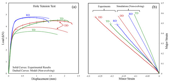 Experimental data of hole tension tests compared with predictions of the finite element model without anisotropy evolution shown in terms of (a) load-displacements; and (b) strain paths. For a better comparison with experimental data, the strain paths from the non-evolving model are plotted up to major strain of approximately 0.6.