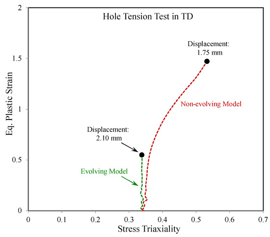 In addition, it can be seen from Figure 16a that simulations with the non-evolving model in the DD and TD directions lead to significantly earlier peak loads than observed in the experiments due to premature localization as a result of lower hardening rates. This behavior is expected to have significant influence on fracture predictions, for instance, using popular phenomenological approaches (e.g., [66,67]) where the stress triaxiality is used to monitor the variations of stress states at critical locations to predict a triaxiality-dependent fracture strain and trigger element deletion. Early localization of the non-evolving model directly affects the stress triaxiality at the critical element, as shown in Figure 17 for the hole tension test in the TD direction, for example. This test direction was selected since the model exhibits the largest discrepancy from the experimental hardening rates. Compared to the evolving model, high stress triaxialities and plastic strains at low global deformation are apparent for the non-evolving model as observed in Figure 17. These large differences show that employing evolving plasticity models to capture the behavior of magnesium alloys is necessary and highlight its importance for simulations (at the cost of inevitable increased model complexity and computational cost).