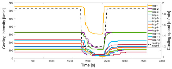 | Casting Speed (m/min) | Loop 7 (L/min) | Loop 8 (L/min) | Loop 9 (L/min) | Loop 10 (L/min) | Loop 11 (L/min) | Loop 12 (L/min) |
