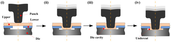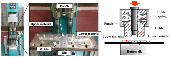 Mechanical joining using forming technology, such as self-piercing rivets and clinching, has emerged as a remarkable technique for joining dissimilar materials because of its low-cost and high-speed fastening [10,11]. Hole-clinching is also one of the new joining methods using forming technology to join dissimilar materials, that are difficult or may even be impossible to apply by the conventional mechanical joining methods [12,13,14]. In hole-clinching, the geometrical interlocking is formed through a pilot hole made on low-ductility materials, as shown in Figure 1. Furthermore, the load-bearing characteristics of a hole-clinched joint is dependent on the geometrical interlocking shape.