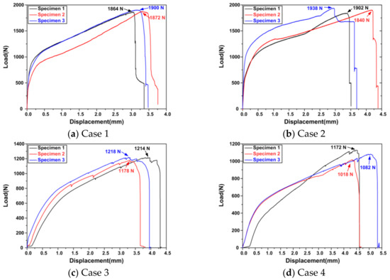 The joint strengths and failure modes for all the experimental cases were evaluated to verify the effectiveness of the proposed analytical approach. The cross-tension test [20] was adopted to simulate the pull-out loading condition, as shown in Figure 5. The load–displacement curves obtained from the cross-tension test are shown in Figure 6. The average joint strength and failure mode of all experimental cases were compared with the values predicted by the analytical approach in Table 4. The joint strengths of Cases 1 and 3 with button separation were evaluated as 1880 ± 28 N and 1203 ± 49 N with errors of ‒3.0 ± 1.4% and 2.8 ± 4.0%, respectively. The joint strengths of Case 2 and Case 4 with neck fracture were 1885 ± 64 N and 1076 ± 45 N with errors of 4.3 ± 3.5% and 0.6 ± 4.1%, respectively.
