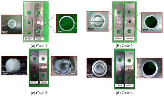 The failure modes of the specimens are shown in Figure 7. In all cases, the same failure mode as predicted in the analytical approach was observed. In Cases 1 and 3, the undercut of the hole-clinched joint was fractured by shear stress, resulting in button separation. These results demonstrate that the joint strength for button separation indicates that the undercut fracture load was caused by shear stress. The undercut of the hole-clinched joint with CFRP and Al6061 was partially fractured, whereas that with DP980 and Al6061 was completely fractured. The joint strength variations of the hole-clinched joint with CFRP and Al6061 were relatively larger than those of the hole-clinched joint with DP980 and Al6061 because of the partial fracture of the undercut.
