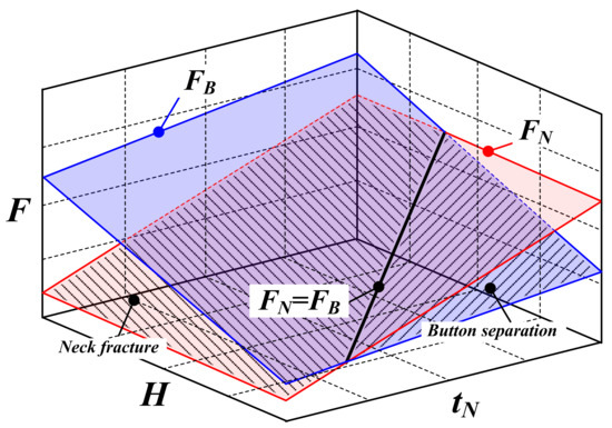 The relationship between the geometrical interlocking parameters and failure-mode dependent joint strength is illustrated in Figure 8. For the given punch diameter, there are two surfaces that indicate the joint strengths of the neck fracture and button separation mode. The intersection line (FN = FB) shows the optimal strength of the hole-clinched joint, where the neck fracture and button separation mode strengths are in equilibrium. This relationship can provide a modification direction for the hole-clinching process design to improve joint strength. When the punch diameter is given, the neck thickness and undercut height, which are needed to obtain the target joint strength, are determined in the initial design step. However, the geometrical interlocking parameters obtained by the plastic deformation in the hole-clinching process are different from the initial design value. Occasionally, because of this, the target joint strength is not reached. Finally, in order to improve the joint strength, it is necessary to modify the design of the hole-clinching process in accordance with each failure mode.