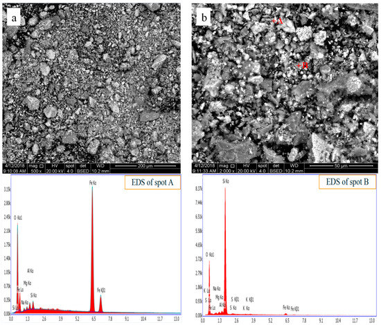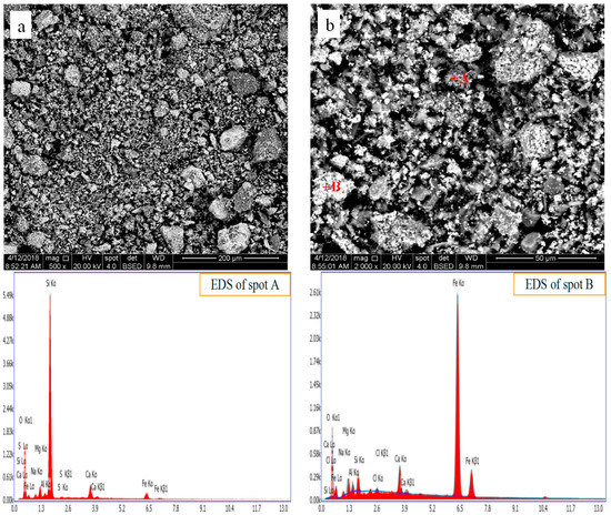 SEM images and corresponding EDS pattern of cyanidation tailing. (a): low magnification image; (b): magnified image of local area in (a).