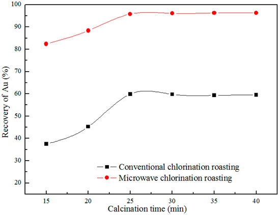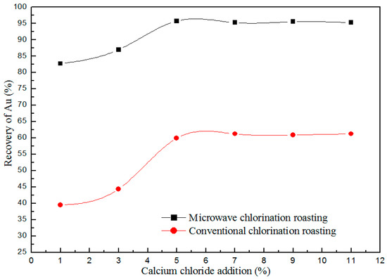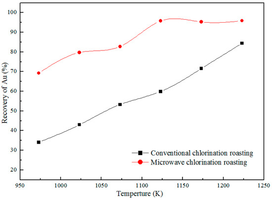 Under the optimization conditions during conventional roasting as follows [13]: calcium chloride adding amount 5%, holding time of 30 min, and CT granularity of 300 mesh, the effects of roasting temperature on the recovery of Au in the microwave field were studied, and the results are displayed in Figure 4. Apparently, the Au recovery of CT during microwave roasting rises sharply from 69.1% to 95.7% with the increase of roasting temperature from 973 K to 1123 K. The recovery of Au during conventional roasting is only 59.9%, which is much lower than that (95.7%) of microwave roasting at the same conditions. Notably, the Au recovery of CT roasted using conventional roasting at 1223 K is much lower than that (95.7%) of microwave roasting at 1123 K, and the microwave roasting is more efficient. Hence, the roasting temperature of 1123 K is chosen as a constant parameter in the subsequent experiments.