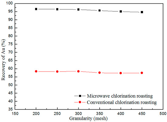 In order to explore the best experimental conditions, the CT roasted in the microwave reactor and the conventional muffle furnace, respectively. The process of roasting experiments is shown in Figure 3. The effect of reaction temperature (700 °C, 750 °C, 800 °C, 850 °C, 900 °C, 950 °C), CaCl2 concentration (1%, 3%, 5%, 7%, 9%, 11%), holding time (15 min, 20 min, 25 min, 30 min, 35 min, 40 min), and particle size (200 mesh, 250 mesh, 300 mesh, 350 mesh, 400 mesh, 450 mesh) on the recovery of the Au was investigated. The recovery of Au was calculated using below formula (1):