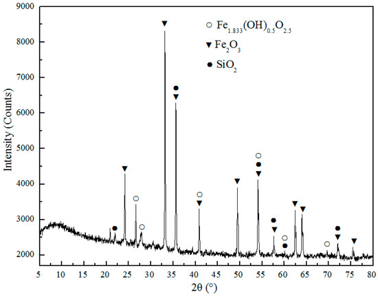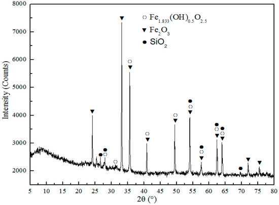 The cyanidation tailing obtained from Yantai city, China. Its main elements analyzed by X Ray Fluorescence (XRF) as shown in Table 1. The content of valuable element Au in CT detected by fire assaying is 10 g/T, and the fire assaying considered as the most reliable analytical method in metallurgy at home and abroad [18]. In addition, the cyanide content in CT is 6 g/T. The phase composition of CT were detected by X Ray Diffraction (XRD) and displayed in Figure 1, and it can be found that the main components in CT are Fe2O3, SiO2, and Fe1.833(OH)0.5O2.5. The microstructure of CT observed with Scanning Electron Microscope (SEM) and the element distribution analyzed with Energy Dispersive Spectrometer (EDS), as shown in Figure 2.