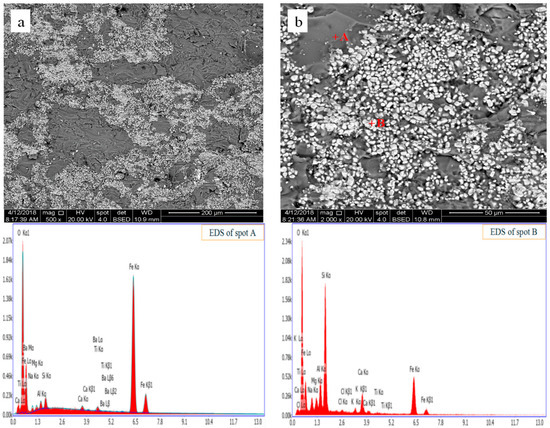 SEM-EDS images of CT after chlorination roasting in the microwave field. (a): low magnification image; (b): magnified image of local area in (a).