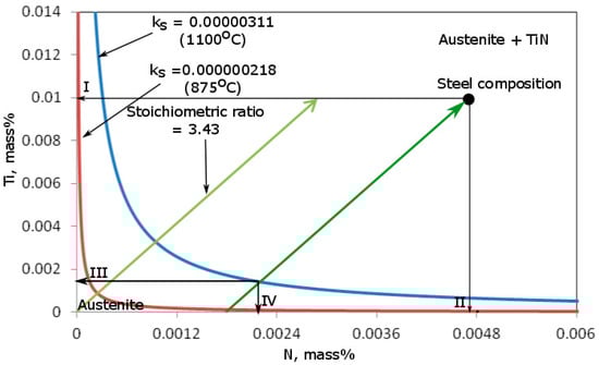 On the basis of the data in Table 2 and Table 3, the corresponding mutual solubility limit diagrams for individual MX-type interstitial phases were prepared (Figure 1 and Figure 2). On their basis, the chemical composition of the solid solution can be calculated, i.e., concentrations of microadditions and metalloids in solid solution and concentrations of microadditions and metalloids fixed in the stable MX phase, as well as a mass fraction of the particles precipitated from the matrix []. Figure 1 presents the solubility diagram for titanium and nitrogen in the austenite for two selected temperatures. The first temperature of 1100 °C corresponds to the austenitizing temperature, whereas the second one (875 °C) is the deformation temperature before cooling. Thus, the initial and final chemical compositions of the solid solution can be determined under equilibrium conditions. The chemical composition of the analyzed steel is also marked on the diagram. The line that represents a stoichiometric ratio of titanium to nitrogen of 48:14 is marked on the diagram. By moving the stoichiometric line parallel to the point indicating the chemical composition of the analyzed steel, an intersection point with the curve indicating the solubility product at a given temperature can be obtained.