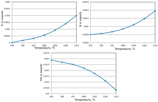Table 4 and Table 5 present the calculated chemical compositions of the austenite as well as TiN and Nb(C,N) mass% fractions, which stay in equilibrium at particular temperatures. Figure 3 and Figure 4 show the corresponding results of the performed calculations of the solubility of TiN and Nb(C,N). In the case of TiN we can see a gradual decrease in the contents of nitrogen and titanium dissolved in solid solution and a subsequent increase in the TiN fraction occuring with decreasing temperature (Figure 3). At the temperature of 1100 °C, there is ca. 14% of the titanium dissolved in solid solution together with 46% of the nitrogen. When the temperature decreases to 850 °C, the titanium is entirely bound in TiN. The amount of dissolved nitrogen at 850 °C is 0.0018 mass%, which corresponds to the results in Figure 1. The amount of Ti required to bind all nitrogen into TiN is 3.4 times the mass percent value of N in the steel. In the case of the analyzed steel, the amount of Ti needed for the complete binding of N is 0.016 mass%. Taking into account the limited titanium concentration in the steel (0.01%), this means that some of the nitrogen content remains dissolved. In practice, this part should be fixed in Nb(C,N). The available content of N at 850 °C is about 0.018 mass% (Figure 3b).