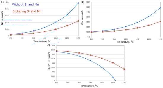 The second analysis concerned Nb(CN). The corresponding results are presented in Figure 4. First, the calculations for the precipitation of Nb(CN) without Mn and Si were carried out (blue lines in Figure 4). The precipitation of Nb(CN) starts at around 1110 °C, and its amount increases with decreasing temperature. It is accompanied by a decrease in the amount of Nb dissolved in the solid solution. At the temperature of 850 °C, almost all niobium is bound in Nb(CN). After that, the calculations included the Si and Mn concentrations in the steel. It can be seen that after taking into account the Si and Mn concentrations, the amount of precipitated Nb(CN) increases at a particular temperature. The difference in the amount of precipitated Nb(CN) is higher at high temperatures and decreases along with the temperature drop. Moreover, the precipitation process starts at a higher temperature. Siciliano and Jonas [] observed that in the case of steel including microadditions of Nb, an increase in the Si content leads to an acceleration of the precipitation of Nb(CN). On the other hand, manganese decreases Nb diffusivity in the austenite and inhibits the precipitation of Nb(CN) []. These results were obtained for the equilibrium conditions. Under real cooling conditions, some higher part of the microadditions stays supersaturated in the solid solution due to undercooling [,]. Comparing the relative effects of Si and Mn in the analyzed steel, one can note that the accelerating effect of the addition of 0.5% Si is greater than the decelerating effect of 1.4% Mn addition.