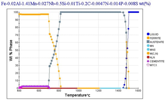 The precipitation behavior of MX-type phases with Nb and Ti microadditions formed under thermodynamic equilibrium conditions was analyzed as the first step. The temperature of TiN precipitation was determined using Equation (1). In the same way, the solubility product of niobium carbonitride was calculated based on Equation (2). This equation takes into account the real concentrations of Mn and Si in the steel. Thermodynamic calculations of the phase transformations of undercooled austenite were simulated using the JMatPro software (version 8.0, Sente Software Ltd, Guildford, UK) package. The CCT (continuous cooling transformation) diagram and TTT (time–temperature–transformation) diagram were designated for continuous cooling and for isothermal cooling, respectively.