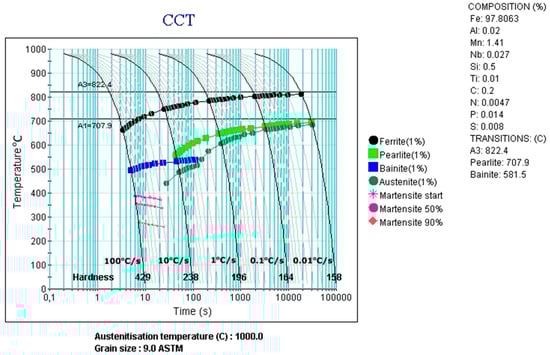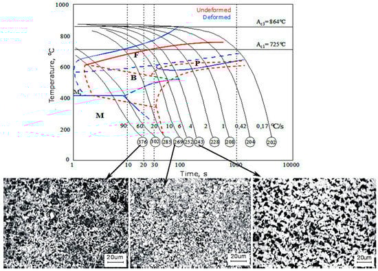 The calculated diagrams were experimentally verified in dilatometric tests. Two types of the diagrams were determined: the CCT diagram for undeformed specimens (Figure 8) and the DCCT (deformation continuous cooling transformation) diagram for deformed specimens (Figure 9). In general, argon cooling was applied. Helium was used for cooling rates faster than 60 °C/s. Hence, the cooling rates covered the entire austenite decomposition range. They were kept stable during the experiment. These diagrams are very important tools for designing a multistep cooling schedule [,].