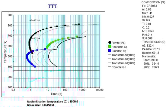 The results of the calculation of the time–temperature–transformation (TTT) diagram are presented in Figure 7. It can be seen that the pearlite trasformation is delayed to longer times at temperatures above 650 °C. There is a risk of pearlite precipitation after about 10 s at 600 °C. The ferritic and bainitic transformations are left-shifted compared with the CCT diagram. The time needed for a complete bainitic transformaton under isothermal conditions is relatively short, i.e., ca. 20 s. The generated diagrams indicate that there are conditions to design a cooling path consisting of ferrite and bainite, but it requires a multistep design instead of continuous cooling [].