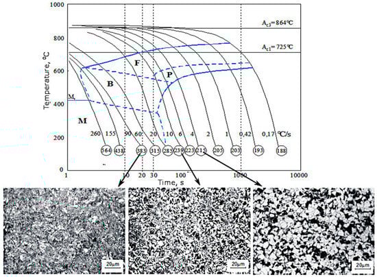CCT diagram of supercooled austenite transformations of the analyzed steel, and microstructures obtained for different cooling rates from 875 °C.