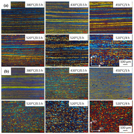 Figure 1 shows the recrystallization degree of the Al–Cu–Li–0.13Zr–0.29Ce alloy (Ce-containing alloy). The degree is far lower than that for the Al–Cu–Li–0.14Zr alloy (Ce-free alloy) under the same conditions, for all annealing processes. As shown in Figure 1a, little recrystallization of the Ce-containing alloy can be observed along the rolling direction for annealing at temperatures below 520 °C. Clear recrystallization only occurs near the sample surface zone after annealing at 520 °C for 1 h. There are still large areas of unrecrystallized grain structures in the middle area of the sample, even for annealing times of up to 4 h (Figure 1a) In contrast to the case for the Ce-containing alloy, unrecrystallized microstructures in the Ce-free alloy can only be observed for annealing at 380 °C for 0.5 h. Significant recrystallization occurs after annealing at 430 °C for 0.5 h, and further recrystallization occurs after annealing at 450 °C for 1 h. Almost complete recrystallization can be observed after annealing at 520 °C for 1 h, as shown in Figure 1b. Ce addition effectively improves the recrystallization resistance of Al–Cu–Li–Zr alloys.