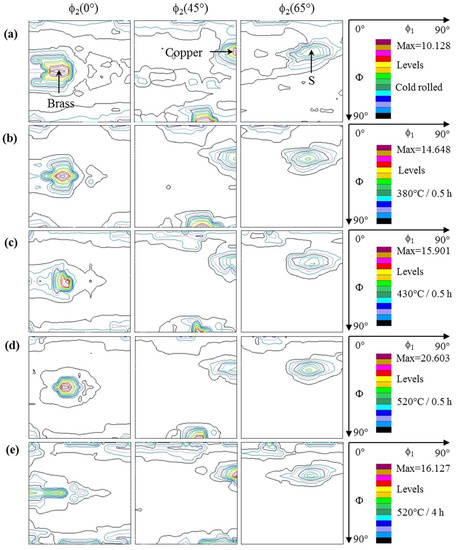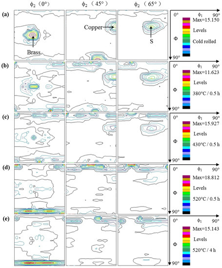 Orientation distribution function (ODFs) representative sections of cold rolled Ce-containing alloy under different annealing temperatures and times: (a) cold rolled; (b) 380 °C/0.5 h; (c) 430 °C/0.5 h; (d) 520 °C/0.5 h; (e) 520 °C/4 h.
