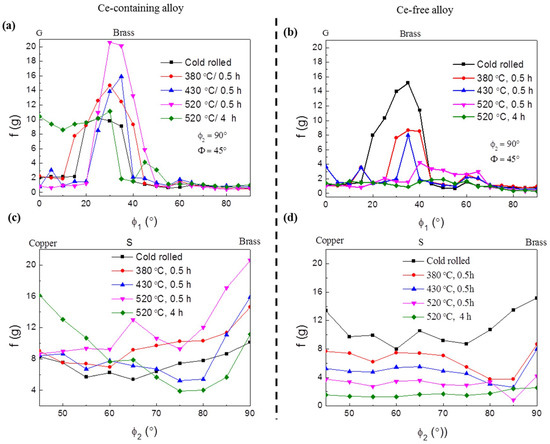 Texture evolution of the experimental alloys annealed under different annealing temperatures and time: (a,b) α-fiber; (c,d) β-fiber.