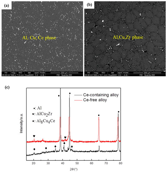 SEM and XRD patterns of the as-homogenized experimental alloys (a) Ce-containing alloy; (b) Ce-free alloy; (c) XRD patterns.