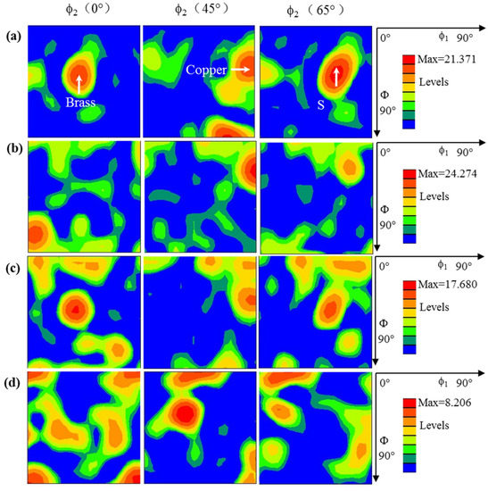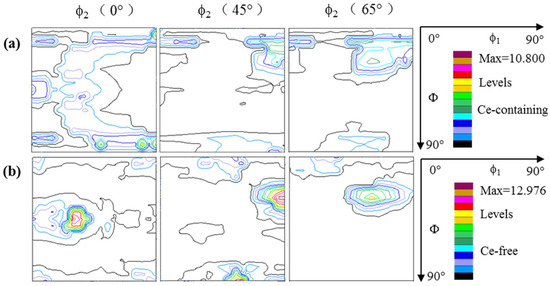 ODFs representative sections of the experimental alloys after the hot rolling stage. (a) Ce-containing alloy; (b) Ce-free alloy.
