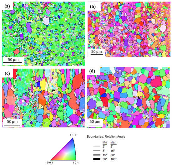 EBSD images of the experimental alloys annealed under different annealing temperatures for 1 h. Ce-containing alloy: (a) 450 °C; (b) 520 °C; Ce-free alloy: (c) 450 °C; (d) 520 °C.