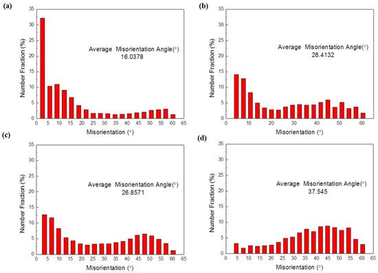 Grain boundary orientation angle distribution of the experimental alloys at different annealing temperatures after 1 h holding. Ce-containing alloy: (a) 450 °C; (b) 520 °C; Ce-free alloy: (c) 450 °C; (d) 520 °C.