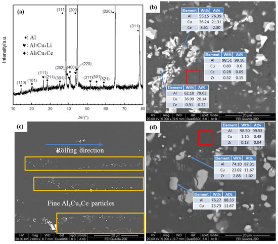 The form and distribution of the Ce enrichment phases were investigated by XRD and SEM to clarify the effects of Ce enrichment particles in Al–Cu–Li–Zr alloys on inhibition of recrystallization; the results are shown in Figure 10. The SEM images and XRD patterns clearly show the presence of Al7Cu4Li, and Al8Cu4Ce phases in the as-rolled Ce-containing alloy (Figure 8a,b). The improved recrystallization resistance achieved by Ce addition to Al–Cu–Li–Zr alloy can be attributed to the formation of these finer Al8Cu4Ce phases. These Al8Cu4Ce phases had been crushed from their skeletal morphologies in the as-cast state into a smaller size by the large strain rolling [14]. Al8Cu4Ce phases have high-temperature stability and hardly redissolve during high-temperature annealing [15], as shown in Figure 10c. Only the fine Al8Cu4Ce particles with diameters smaller than 1 μm have been counted, as shown in Figure 10c. The effective pinning provided by Ce-containing dispersoids is mainly restricted in the Al3Zr dispersoid-free area. As a result, only the fine Al8Cu4Ce particles in Al3Zr dispersoid-free area have been counted (Insider the box in Figure 10c). The estimation of the Zener pressure by fine Al8Cu4Ce particles has been presented, as below [29].