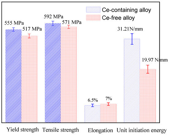 Figure 11 shows that the tensile strength and yield strength of the Ce-containing alloy were higher than those of the Ce-free alloy, by 21 and 38 MPa, respectively, after solid-solution and aging treatment. The average grain size (incl. sun-grain sizes) of the experimental alloy after solid solution treatment at 520 °C for1 h is 5.32 μm in Ce-containing alloy and 31.23 μm in Ce-free alloy respectively, as shown in Figure 7. The strength increment by grain refinement in two alloys can be achieved through Hall-Peatch relationship [33]: