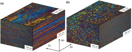 Three direction optical micrographs of (a) Ce-containing and (b) Ce-free alloys after annealing at 520 °C for 1 h.