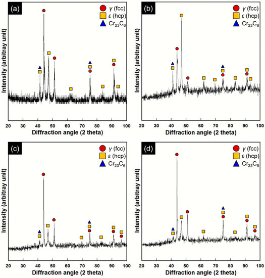 XRD patterns of the Co–Cr alloys in the as-pre-sintered state (a) and in the post-sintered states (prepared at three different temperatures): (b) 1250 °C; (c) 1350 °C; (d) 1450 °C. The Co-based γ (face-centered cubic, fcc) and ε (hexagonal close-packed, hcp) matrix phases were identified with JCPDS cards no. 15-806 and no. 05-727, respectively. The peaks indexed as Cr23C6 metal carbides were identified by JCPDS card no. 35-783.