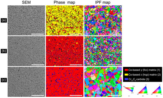 SEM/EBSD images of the Co–Cr alloys prepared at three different post-sintering temperatures: (a) 1250 °C; (b) 1350 °C; (c) 1450 °C (250×, scale bar = 100 μm).