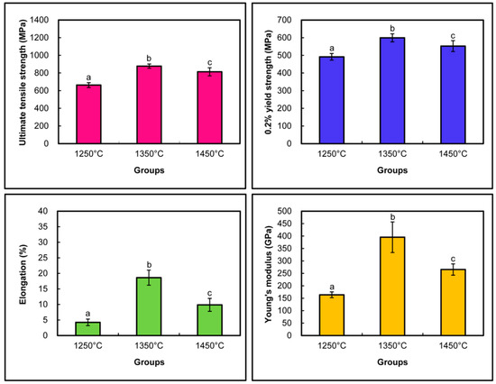 Comparison of mechanical properties of the Co–Cr alloys prepared at three different post-sintering temperatures (1250, 1350 and 1450 °C) (n = 6). For each figure, means with different lower-case letters indicate statistical differences among the three groups (p < 0.05).