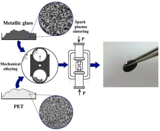 The main criterion for the selection of the polymeric material was its ability to get soft in the super cooled temperature region of the metallic glass phase. Polyethylene terephthalate (PET) is relative to this temperature range. This polymeric material is in the liquid state at a temperature close to the supercooled liquid region of the chosen metallic glass, and is capable of interacting with the metallic glass particles. Similarly, PET was chosen for its wide distribution and low cost.
