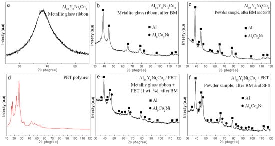 X-ray diffraction (XRD) pattern of the Al85Y8Ni5Co2 ribbon (a), Al85Y8Ni5Co2 ribbon, after ball milling (BM) (b), Al85Y8Ni5Co2 bulk sample, after BM and spark plasma sintering (SPS) (c) and polyethylene terephthalate (PET) powder (d), composite Al85Y8Ni5Co2/PET powder, obtained BM (e), composite Al85Y8Ni5Co2/PET bulk sample, obtained by BM and SPS (f).