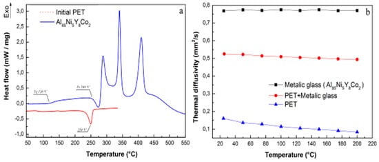 Differential scanning calorimetry (DSC) analysis of the Al85Y8Ni5Co2 ribbon sample and polyethylene terephthalate powder sample (a), and thermal conductivity of pure PET samples, Al85Y8Ni5Co2 metallic glass, and composite samples (b).