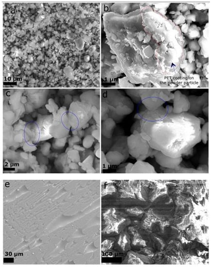 SEM images of the obtained samples: Surface of the composite sample Al85Y8Ni5Co2 + PET (1%) obtained by SPS (a), the particle coated by PET (b), neck formations between some of the particles during SPS process (c,d), surface of the Al85Y8Ni5Co2 ribbon sample (e), and polyethylene terephthalate bulk sample (f).