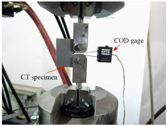 Tensile tests and FCP tests were performed on a MTS810-50 KN (MTS Systems Corporation, Eden Prairie, MN, USA) electro-hydraulic servo fatigue machine. Tensile specimens were cut in the rolling direction of the plate and tested in accordance with ASTM-E8M-2004 at room temperature, with a strain rate of 2 mm/min, resulting in an average of three samples. The FCP rate tests were conducted in ambient air at a room temperature of 18 °C–25 °C and a relative humidity of 40–60% in accordance with ASTM-E647. The FCP specimens were of the compact tension (CT) geometry, as shown in Figure 2. FCP tests were characterized for constant amplitude loading at a frequency of 10 Hz and a stress ratio of 0.5. Crack length was measured by using a crack opening displacement (COD) gauge, as shown in Figure 3. The hardness tests were completed on a HVS-1000Z Vickers micro digital hardness machine (Huayin Testing Instrument Co., Ltd., Yantai, China) with a holding pressure of 3 KN for 15 s. The average of five test points per sample was taken as the hardness value.