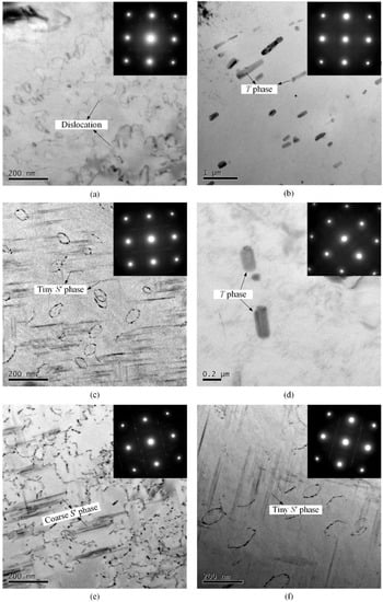 Large quantities of needle-shaped, fine transition phases—the densely distributed S’ phases—were observed (Figure 4c) in the alloy that was creep aged for 9 h (CAF-9h), with sizes ranging from 150~250 nm. The precipitates in the alloy that was stress-free aged for 9 h (SFA-9h) were still not evident in the bright field images (Figure 4d). After creep aging for 24 h (CAF-24h), the precipitates continued to grow and thicken, reaching sizes of about 200~400 nm (Figure 4e), and the clearance between precipitates widened significantly. From the SAED pattern in Figure 5c, it is inferred that the main strengthening phase in grains occurs in the S’ phase. In the alloy that was stress-free aged for 24 h (SFA-24h), precipitates with sizes of about 200 nm~300 nm occurred (Figure 4f), which were smaller than those found in the CAF-24h alloy (Figure 4e). The precipitation behavior shows that the presence of stress during creep aging promoted the precipitation. Some scholars contend that a great deal of nucleation precipitates from the high-density dislocations that are caused by creep stress. Then, these dislocations act as fast diffusion channels to aggregate the solute atoms toward heterogeneous nucleation, thus promoting the growth of S′ phases [27].
