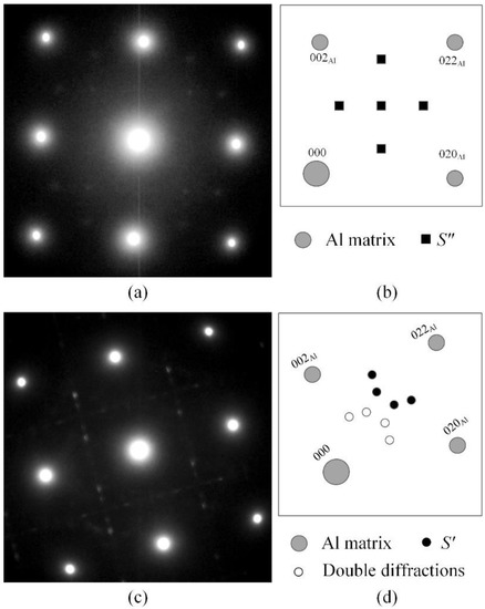SAED patterns along a <100>Al zone axis and corresponding schematic diagrams for AA2524: (a,b) CAF-4h; (c,d) CAF-24h.