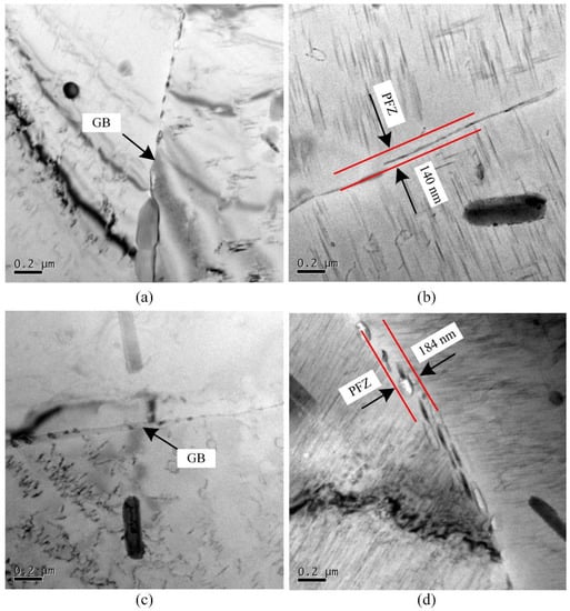 Figure 6 shows the grain boundary feature of AA2524 samples that were creep aged and artificially aged for 9 h and 24 h. There was no apparent precipitation-free zone (PFZ) at the grain boundary (Figure 6a,c) in either the CAF-9h or SFA-9h alloys, and the precipitates at the grain boundary showed discontinuous distribution. After aging for 24 h, a distinct PFZ (Figure 6d) with a width of about 184 nm appeared at the grain boundary in the SFA-24h sample, while the PFZ (Figure 6b) in the CAF-24h sample was 140 nm wide—narrower than that of the stress-free aged sample. From this, it can be explained that creep stress generates a large number of dislocations in grains. These dislocations promote the surrounding preferential precipitation, resulting in more uniform precipitation kinetics of the strengthening phases in grains and grain boundaries, thus narrowing the PFZ.