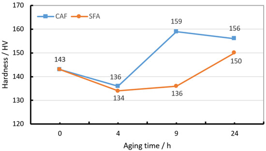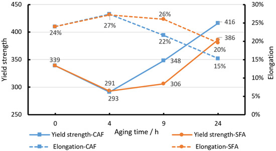 Figure 7 and Figure 8 show the conventional mechanical properties for AA2524 under creep aging and stress-free aging, respectively. As the aging time increased, the hardness of AA2524 first increased and then decreased (Figure 7), clearly reflecting characteristics that occur at three aging stages: under aging (4 h of aging), peak aging (9 h of aging), and over aging (24 h of aging). For the stress-free aged alloy, the hardness decreased within the aging time of 0 h~4 h (Figure 7) and increased from 9 h to 24 h. However, the hardness changed slightly during the 4 h~9 h range of time, indicating an apparent plateau region. The study done by Ringer et al. [28] on the low Cu/Mg ratio Al-Cu-Mg alloy confirmed that the hardening curves of the Al-Cu-Mg alloy, at an aging temperature ranging from 100 °C to 240 °C and within an α-S phase region, displayed an obvious plateau region. Experimental results in the present paper are consistent with this conclusion. In contrast, there was no hardness plateau region under creep aging. After aging for 9 h, the hardness of the CAF-9h alloy rapidly reached a peak value of 159 HV, 16.9% higher than that of the SFA-9h alloy (136 HV). This indicates that creep aging significantly accelerates the hardening rate and improves the hardness of the alloy.