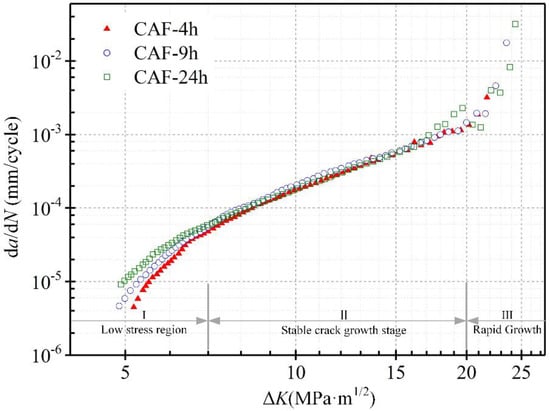 In the stable crack growth stage—namely when ΔK = 7~16 MPa·m1/2—the Paris region precipitates, with a higher ΔK level, showed a weakened effect on the FCP rate. Figure 9 displays that the crack growth rate of the CAF-9h sample was slightly higher, but the difference in FCP rates under these three conditions was much smaller than that of the low ΔK level. When ΔK ≥ 16 MPa·m1/2, da/dN ≥ 10−3 mm/cycle, and the da/dN-ΔK curves showed an apparent knee, this indicated that the crack propagation had entered a rapid growth stage.