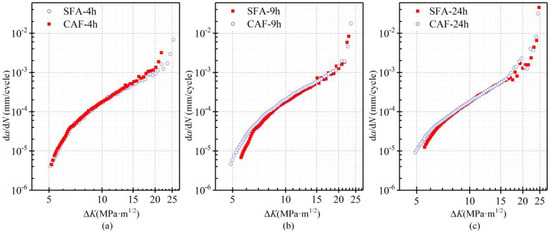 After 9 h of aging, needle-shaped S′ phases that were semi-coherent with the matrix (Figure 4c,d) mainly precipitated. However, the presence of stress in the creep aging process promoted the precipitation, so the sizes of the S′ phases in the CAF-9h alloy were larger. Under the cyclic loading, dislocations could not cut through part of the coarse S′ phases and instead bypassed them, thus reducing the reversibility of cyclic slip, accumulating a large plastic deformation at the crack tip, and promoting crack propagation. In the region of ΔK ≤ 7.5 MPa·m1/2, the fatigue crack propagation resistance of the CAF-9h alloy was lower than that of the SFA-9h alloy.