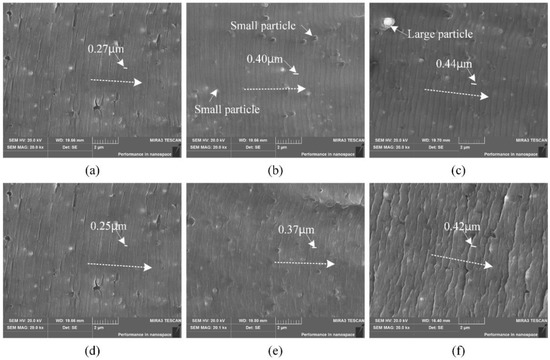 Fatigue striation morphology at fractures of different specimens when ΔK = 6 MPa·m1/2: (a) CAF-4h; (b) CAF-9h; (c) CAF-24h; (d) SFA-4h; (e) SFA-9h; (f) SFA-24h.